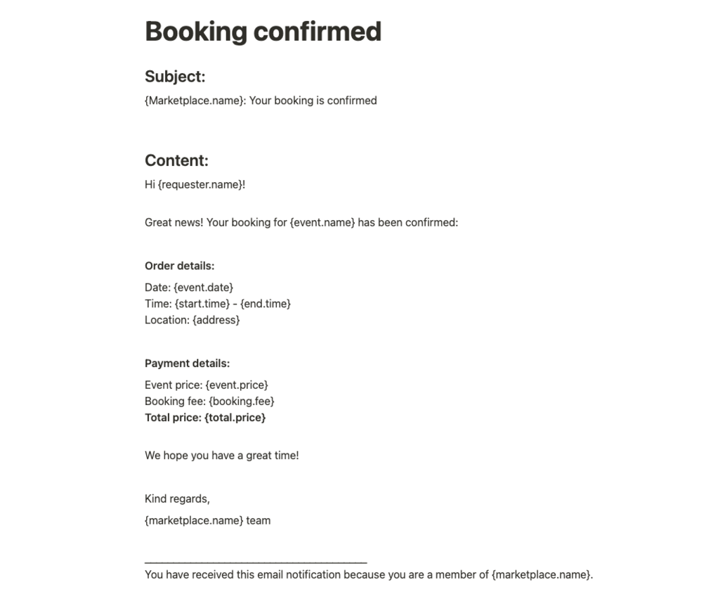 Transaction emails are notifications that you should send your users at various stages of the transaction process. For example, you might want to send a supplier a notification each time they receive a new booking. You might also want to send a customer a notification after the event to ask them to review the supplier.