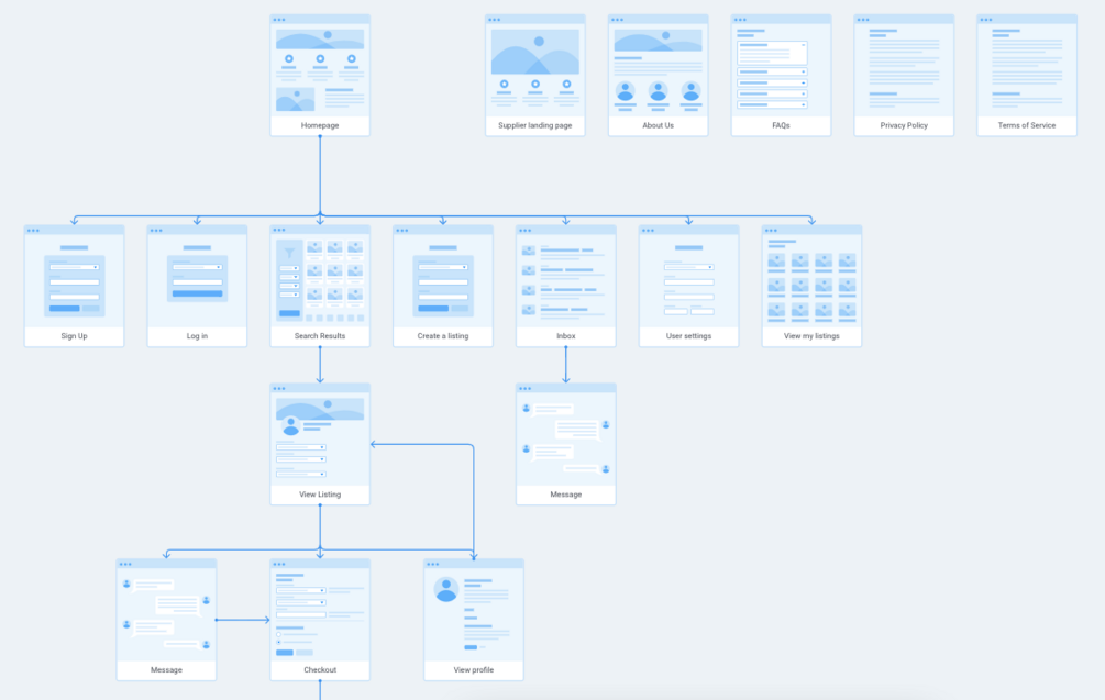 A user flow diagram shows the path each user takes when using your product. It details all of the steps in each user journey such as how a supplier creates a listing and how customers can make a booking with a supplier.